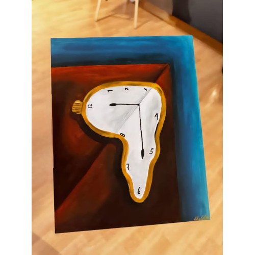 رسمة لساعة موضوعة على الطاولة ويبدو شكلها ذائبًا ومتشوّهًا، كأنها تذوب ببطء، مع خطوط منحنية وانسيابية تعكس إحساسًا بالوقت المتغير والمائع.