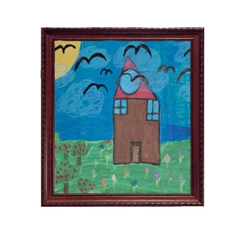 لوحة فنية ساحرة بريشة نورة، تُصوّر بيتًا دافئًا وسط الأعشاب الخضراء والطيور التي تحلّق تحت سماء مزينة بالسحب البيضاء. تمتزج الألوان الهادئة لتمنح إحساسًا بالسكينة والطبيعة، مما يجعلها قطعة مثالية تضيف الجمال والطمأنينة لأي مكان.